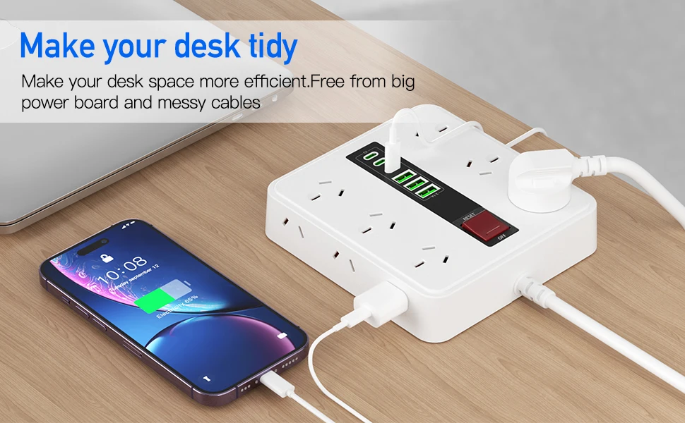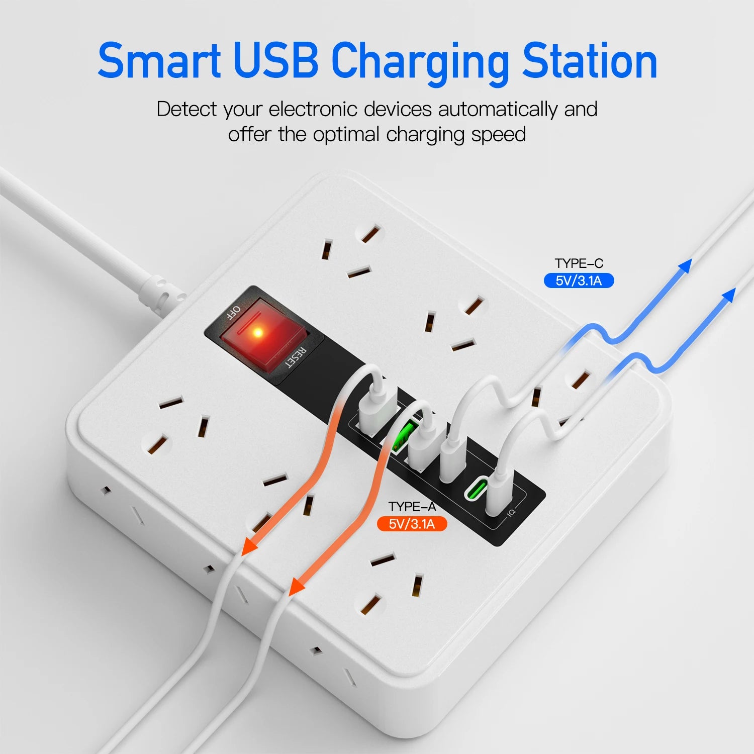 Australian plug power board 6/12 power sockets 6 USB (3A+3C) smart charging overload protection switch 1.8M extension cable