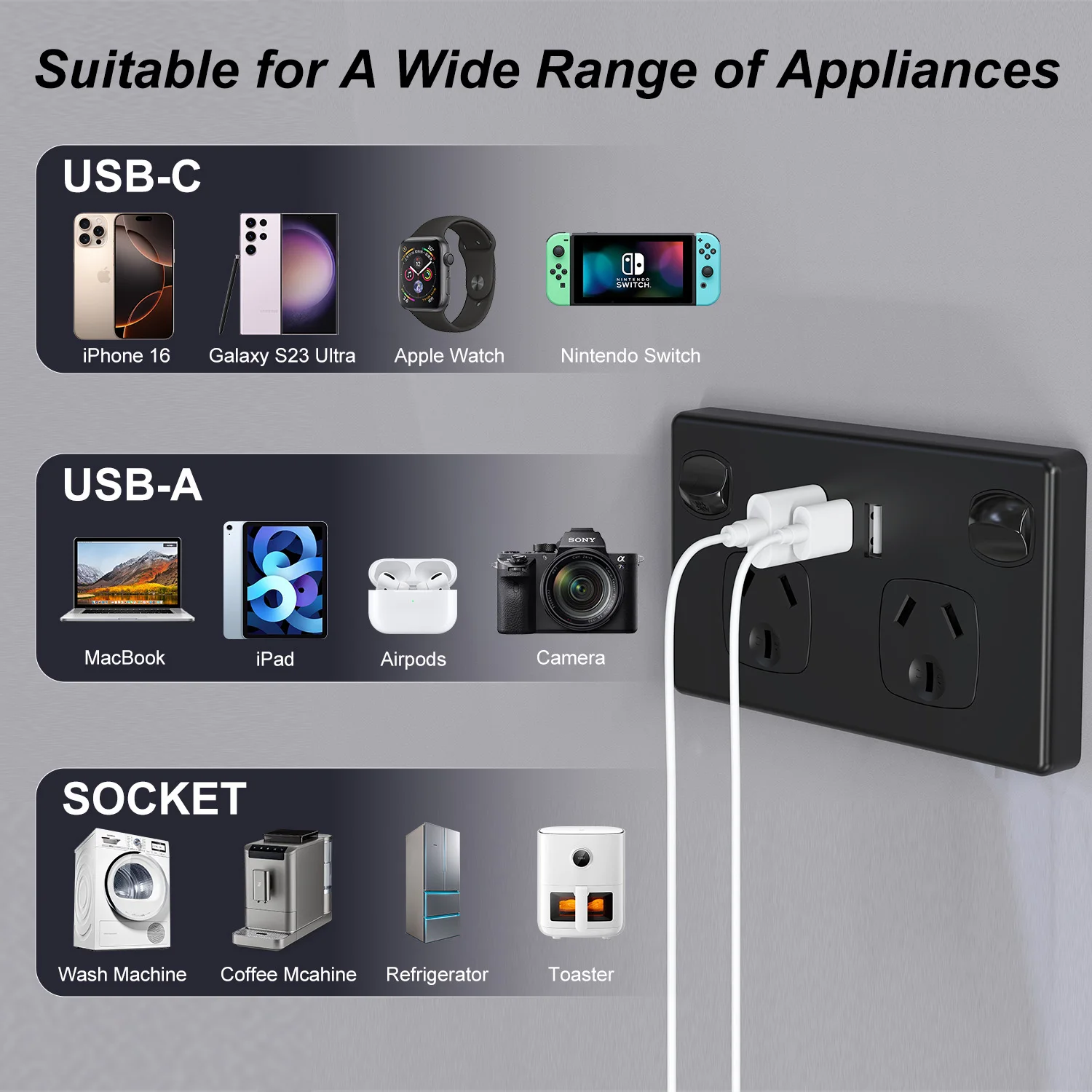 ✔ Safety First. This USB-C GPO conform to Australian standards AS/NZ3112:2017 Approval and test specification-Plugs and socket-outlets.